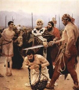 Ἔργο τοῦ Ρώσου ζωγράφου Ἴλια Ρέπιν, μὲ τὸν «ἐπίσκοπο Νικόλαο τῶν Μύρων(τῆς Λυκίας) νὰ σώζῃ τρεῖς ἀθώους, ἀπο τὸν θάνατο». Βρίσκεται στὸ Ἑρμιτᾶζ στὴν Ἁγία Πετρούπολη