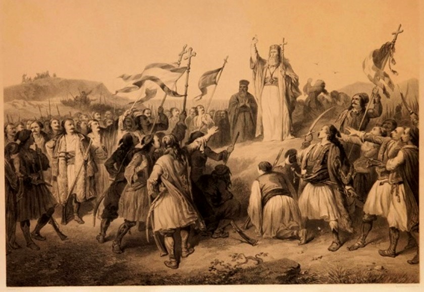 1821.—Ο Παλαιών Πατρών Γερμανός, κηρύσσει την έναρξη τής Επαναστάσεως στην Πλατεία Αγίου Γεωργίου Πατρών, και ορκίζει τους αρχηγούς Ανδρέα Ζαΐμη, Ανδρέα Λόντο και Μπενιζέλο Ρούφο με τους 1.000 περίπου άντρες τους. Οι Επαναστάτες αναφωνούν το ιστορικό «Ελευθερία ή Θάνατος», κάτω από τους τουρκικούς κανονιοβολισμούς τού φρουρίου τής πόλεως. Στην συνέχεια συστήθηκε Επαναστατικό (ή Αχαϊκό) Διευθυντήριο, το οποίο τέθηκε τιμητικά υπό την ηγεσία τού Επισκόπου Γερμανού.