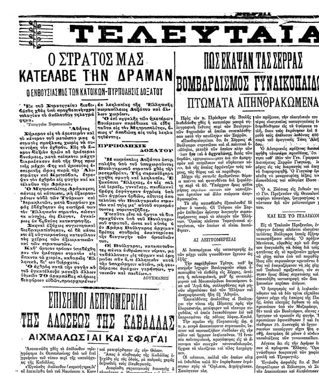 .—Η Ελληνικές V και II Μεραρχίες επιτίθενται εναντίον των βουλγαρικών φαλαγγών πλησίον τού Νευροκοπίου. Οι Ελληνικές Μεραρχίες συνεχίζουν τις σκληρές και πεισματώδεις μάχες εναντίον των βουλγάρων.