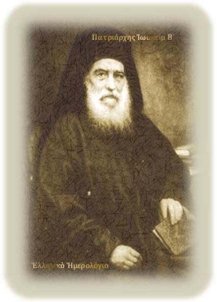 ……….Στὶς 4 Αὐγούστου τοῦ 1878, ἀπεβίωσε ὁ Πατριάρχης Κωνσταντινουπόλεως, Ἰωακείμ Β΄(κατὰ κόσμον Ἰωάννης Κοκκώνης). Γεννημένος στὰ 1802, στὴν διάρκεια τῆς πολυτάραχης σταδιοδρομίας του ἀνέβηκε δύο φορὲς στὸν πατριαρχικὸ θρόνο. Ἀπ’ τὶς 4/10/1860 ἔως τὶς 9/7/1863 – ὁπότε ἐξαναγκάσθηκε σὲ παραίτηση ἀπὸ τὴν Ὑψηλὴ Πύλη – καὶ κατόπιν ἐπανακλογῆς του, ἀπὸ τὶς 23/11/1873 ἔως τὸν θάνατό του, στὶς 4/8/1878.