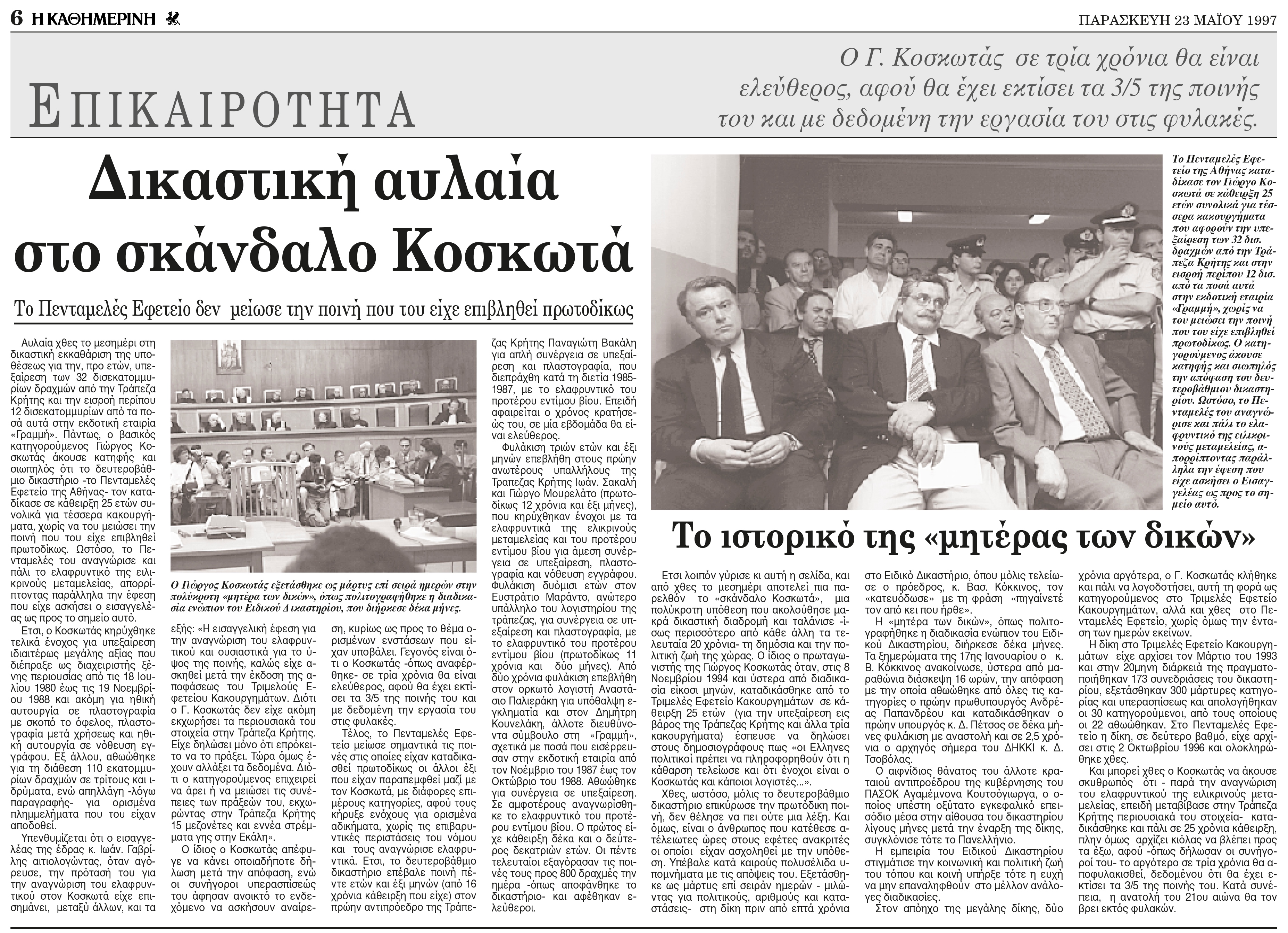 .—Έναρξη τής δίκης τού «μεγαλοαπατεώνα» Γεώργιου Κοσκωτά σε δεύτερο βαθμό, στο πενταμελές Εφετείο Αθηνών, με την κατηγορία τεσσάρων κακουργημάτων τα οποία αφορούν την υπεξαίρεση 32 δισ. δρχ. από την Τράπεζα Κρήτης και την εισροή 12 δισ. δρχ. (από τα ποσά αυτά), στην εκδοτική εταιρία ‘’Γραμμή’’. Μέρος των χρημάτων χρησιμοποίησε και για την δωροδοκία πολιτικών. Η πρωτοβάθμια απόφαση τού τριμελούς Εφετείου Κακουργημάτων τής 8ης Νοεμβρίου 1994, τον είχε καταδικάσει σε είκοσι πέντε χρόνια κάθειρξη. Στα ίδια χρόνια καταδικάστηκε τελικά και από το δευτεροβάθμιο Πενταμελές Εφετείο στις 22 Μαΐου 1997. Ωστόσο, τού αναγνώρισαν και πάλι το ελαφρυντικό τής ‘’ειλικρινούς μεταμελείας’’. Ο Γεώργιος Κοσκωτάς αποφυλακίστηκε στις 16 Μαρτίου 2001, έχοντας εκτίσει τα 3/5 τής ποινής του. Δεν επέστρεψε ποτέ τα ποσά που υπεξαίρεσε, καθώς εκείνη την εποχή δεν υπήρχε νόμος γιά την επιστροφή στο Δημόσιο χρημάτων από υπεξαιρέσεις, εφ’ όσον η ποινή τής φυλακίσεως θεωρούνταν αρκετή ως τιμωρία.