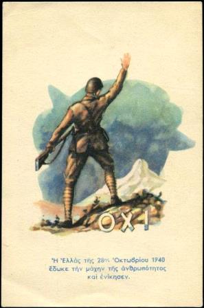 1940.—Ὁ Ἰωάννης Μεταξᾶς, ἀπορρίπτει τὸ τελεσίγραφο τῆς Ἰταλίας τὸ ξημέρωμα τῆς 28ης Ὀκτωβρίου 1940 και ἀποδέχεται τὸν πόλεμο χωρὶς κανένα δισταγμό. Εἶχε ἀποφασίσει συνειδητά, παρὰ τὴν φ α ι ν ο μ ε ν ι κ ὴ ἰδεολογικὴ συγγένεια μὲ τὰ καθεστῶτα τῆς Γερμανίας καὶ τῆς Ἰταλίας, νὰ βαδίσῃ μὲ τὴν χώρα καὶ τὸν λαὸ του ἑνωμένο στὸν ἀναπόφευκτο πόλεμο, ἀποφεύγοντας τὴν διαίρεση σὲ στρατόπεδα ὅπως εἶχε συμβεῖ μὲ τραγικὰ ἀποτελέσματα τὴν περίοδο τοῦ ἐθνικοῦ διχασμοῦ τὸ 1915. Ἔκτοτε, ἡ ἱστορικὴ αὐτὴ ἡμέρα ἐορτάζεται ὡς ἡ ἡμέρα τοῦ «ΟΧΙ».