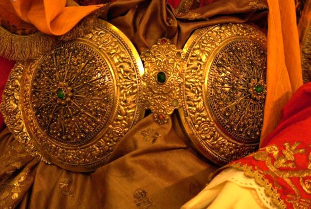……….(…) Ὅταν ἡ νύφη ἔβγαινε στὸ κατώφλι τοῦ σπιτιοῦ της, τὰ ὄργανα ἔπαιζαν ἕνα λυπητερὸ σκοπό, τὴν Γκουβάνα. Ἔκανε ἀργὰ καὶ μὲ κλάματα 3 φορὲς τὸν σταυρὸ της, ἔπειτα ἔσπαγε ἕνα καρβέλι στὰ δύο καὶ τὸ μισὸ τὸ ἔδινε πίσω, γιὰ τὴν παλιὰ της ζωὴ καὶ τὸ ἄλλο μισὸ μπροστὰ της, γιὰ τὴν καινούργια ζωὴ ποὺ ἄρχιζε. Στὴν συνέχεια, ἀποχαιρετοῦσε τοὺς συγγενεῖς της. Φιλοῦσε τὸ χέρι ὅλων τῶν παρευρισκομένων, ἀκόμα καὶ τῶν μικρῶν παιδιῶν καὶ δεχόταν ἀγκαλιές, φιλιὰ καὶ φλουριᾶ ποὺ τὰ καρφίτσωναν στὴν τραχηλιὰ της.