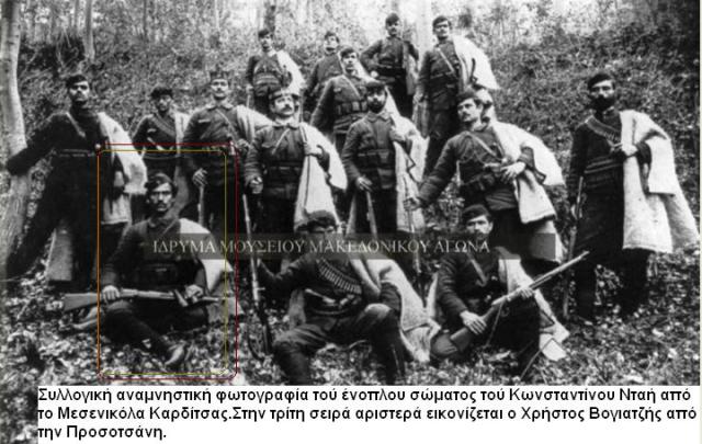 ……….Πληροφορίες εικόνας : Συλλογική αναμνηστική φωτογραφία τού ένοπλου σώματος τού Κωνσταντίνου Νταή από το Μεσενικόλα Καρδίτσας. Η φωτογραφία τραβήχτηκε στο όρος Παγγαίο.Ο καπετάν Τσάρας εικονίζεται στην δεύτερη σειρά, όρθιος και τέταρτος από δεξιά, ντυμένος με στρατιωτική ενδυμασία και μισοφορεμένη κάπα· κρατά το όπλο του παρά πόδα. Οι υπόλοιποι εικονιζόμενοι είναι από τα αριστερά στα δεξιά, στην πρώτη σειρά: Δημήτριος Πέντσας από το Παγονέρι, Ιωάννης Παρούσης από τη Νέα Ζίχνη, Κωνσταντίνος Τσελέγκας από το Ροδολίβος, Δημήτριος Κομήτης από το Δοξάτο και Γεώργιος Καραγεωργίου από το Βώλακα. Στην δεύτερη σειρά, οι: Λεωνίδας Μαλαμίδης από το Ροδολίβος, Γεώργιος Καράμπελας από τη Στενήμαχο, Δημήτριος Εύζωνας από το Αγρίνιο, ο ίδιος ο Κωνσταντίνος Νταής, Γεώργιος Χαραμής από τη Μάνη, Μιλτιάδης Τσοπανέλης από τις Κυδωνίες τής Μικράς Ασίας και Αθανάσιος Λαζάρου από τα Ιωάννινα. Στην τρίτη σειρά αριστερά εικονίζονται οι Χρήστος Βογιατζής από την Προσοτσάνη, Ηλίας Εύζωνας από το Αγρίνιο και Πολυχρόνης Παλιάγκας από την Χωριστή.